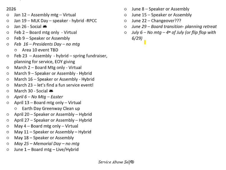 Our meetings occur every week (subject to change) and feature a new speaker on topics of diverse interest to Rotarians, our town, and general subjects.